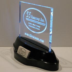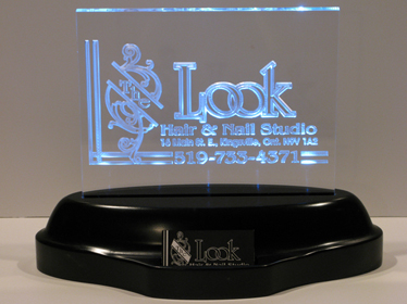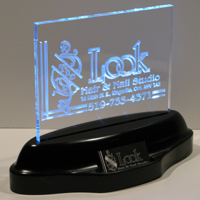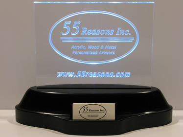 Business Card Displays - Elegantly display your company logo and your business cards on this beautiful custom carved acrylic sculpture set in an illuminated base with an integrated business card holder. The base is 14" long by 6" deep and illuminates the acrylic with LEDs. We will custom carve your logo or your business card or whatever you wish on the acrylic piece. Show your customers that you are a quality company by proudly displaying this breathtaking acrylic sculpture and business card holder at your customer reception area.