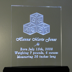 Birth Announcements - This 8" x 10" x 1/2" thick, LED illuminated acrylic piece is an elegant reminder of a very special event.
