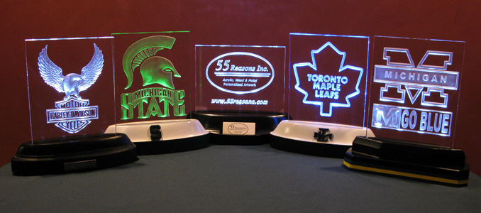 Other Examples to Provoke Your Imagination - Here are more 8" x 10" x 1/2" thick acrylic pieces that have been carved out on the backside and set in LED light bases. As options, we can lite your acrylic sculpture in color and/or we can customize your base. These pieces are examples for inspiration only. 55 Reasons Inc. creates unique, one of a kind acrylic scultures to customer order. We do not hold licenses to produce copyrighted material.