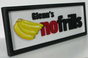 Glenn's Nofrills Grocery Store - This full three dimensional sign was CNC cut in high density polyurathane foam board and hand painted.