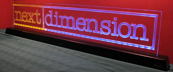Next Dimension Inc. - This custom made acrylic sign is over 6 feet long. The giant sized company logo was carved in 3D in the backside of the acrylic and illuminated in the colors of their logo with LEDs. Click Here to check out our other carved acrylic products illuminated with LEDs. (BTW - Next Dimension Inc. is a top notch IT company. Check them out at Next Dimension Inc.)