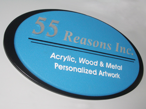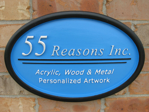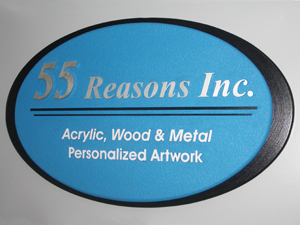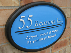 55 Reasons Inc. - One of our own signs is a layered dimensional sign made of sign foam using masking and sandblasting techniques. The "55" was CNC cut separately and silver leafed. The sign is about 30" wide by about 20" high.